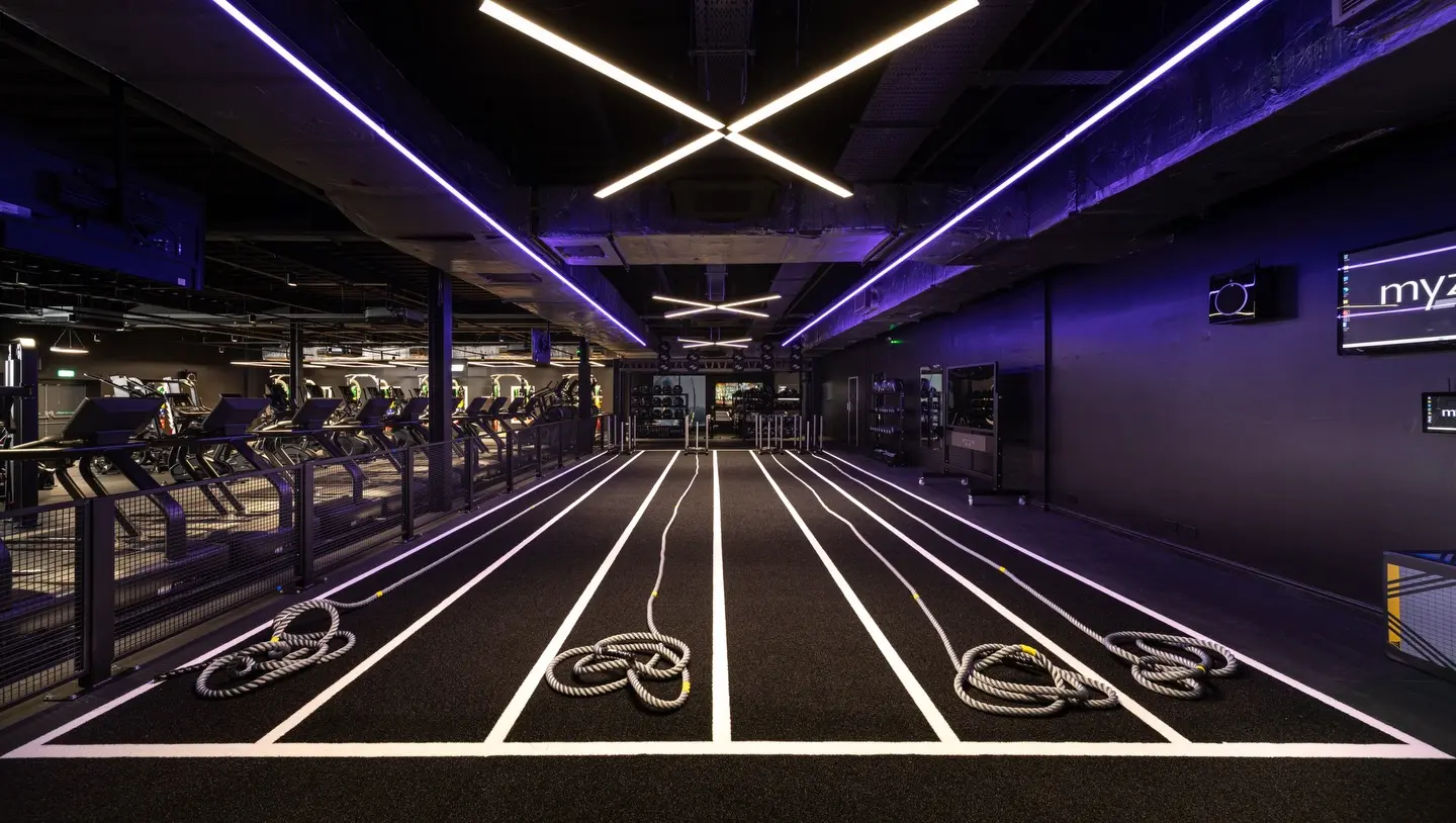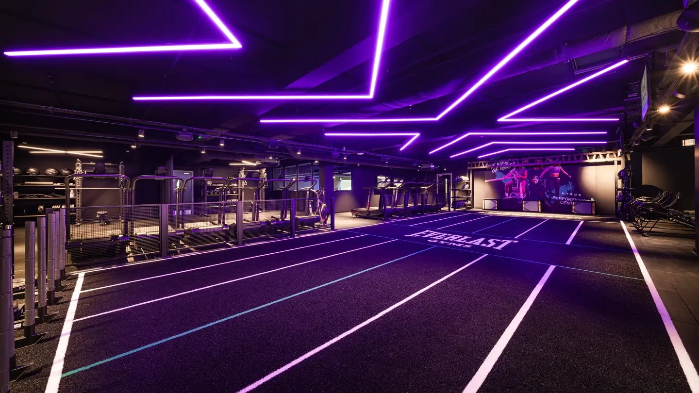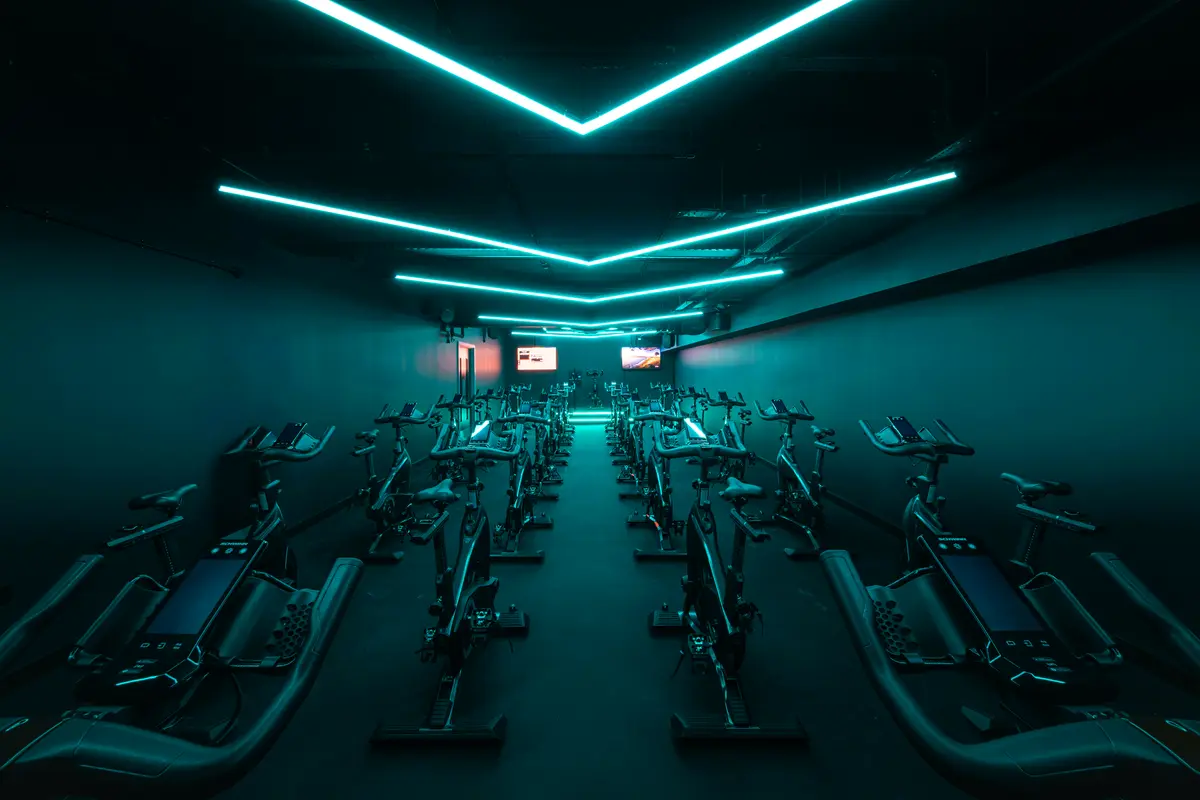 Inside the spin studio, PACE takes centre stage. Installed in a striking chevron formation, the system creates a bold visual focal point that drives energy and focus throughout every session.